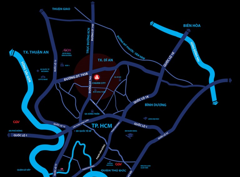 Charm Diamond nằm ngay trục ĐT743 – ngã tư 550, một trong những nút giao thông quan trọng: